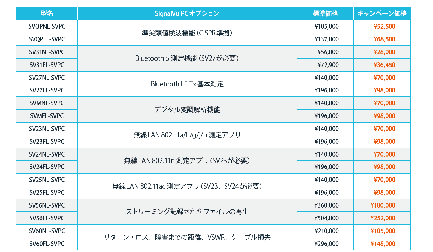 株式会社TFF テクトロニクス社は、RSA306B型、RSA500AシリーズまたはRSA600Aシリーズ本体ご購入時にSignalVu-PCソフトウェア・オプションを最大3個まで50%OFFの特別価格でご購入いただけるキャンペーンです。