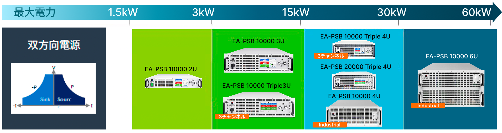 テクトロニクス製品に新しく加わったElektro-Automatik(以下:EA製品)は、ベンチから大電力まで、1.5kWから、並列連結して最大3.8MWまでの構築に対応する幅広いラインアップをご提供しています。テクトロニクスの先進的なオシロスコープ、スぺクトラム・アナライザ、信号源に加え、ケースレー製品とEA製品の高出力技術ラインを組み合わせることで、より正確で効率的なソリューションをご提供できるようになりました。